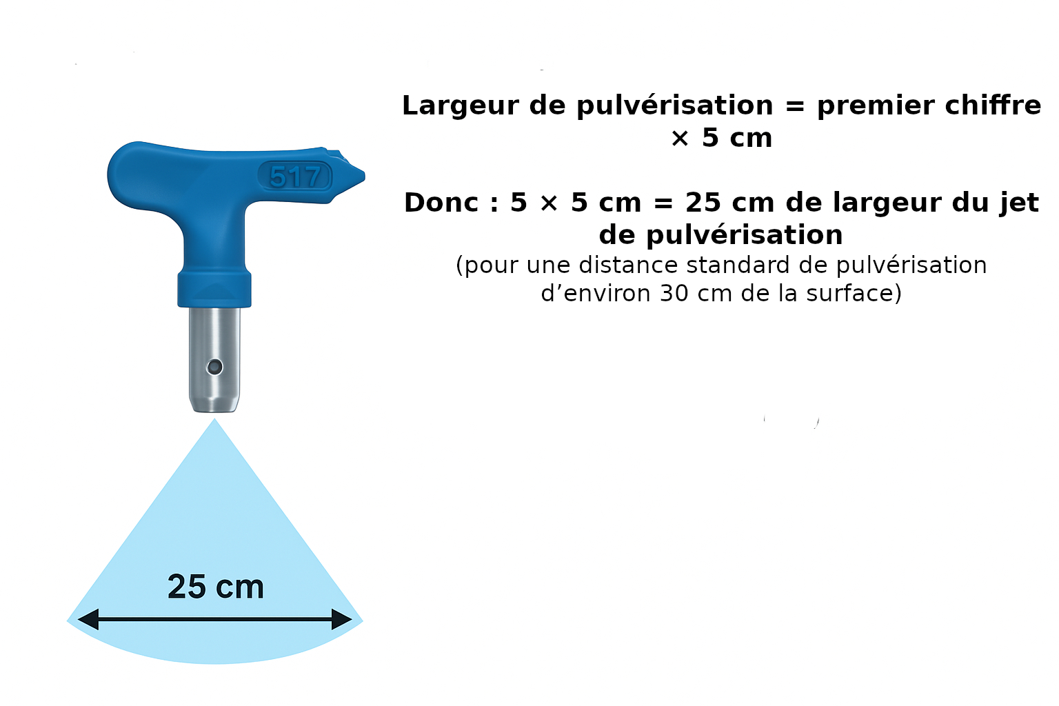 Chaque buse porte une désignation numérique indiquant la largeur de pulvérisation et le diamètre de l’orifice par lequel la peinture passe. Plus l’orifice est grand, plus la quantité de peinture est importante et plus le matériau peut être épais.
