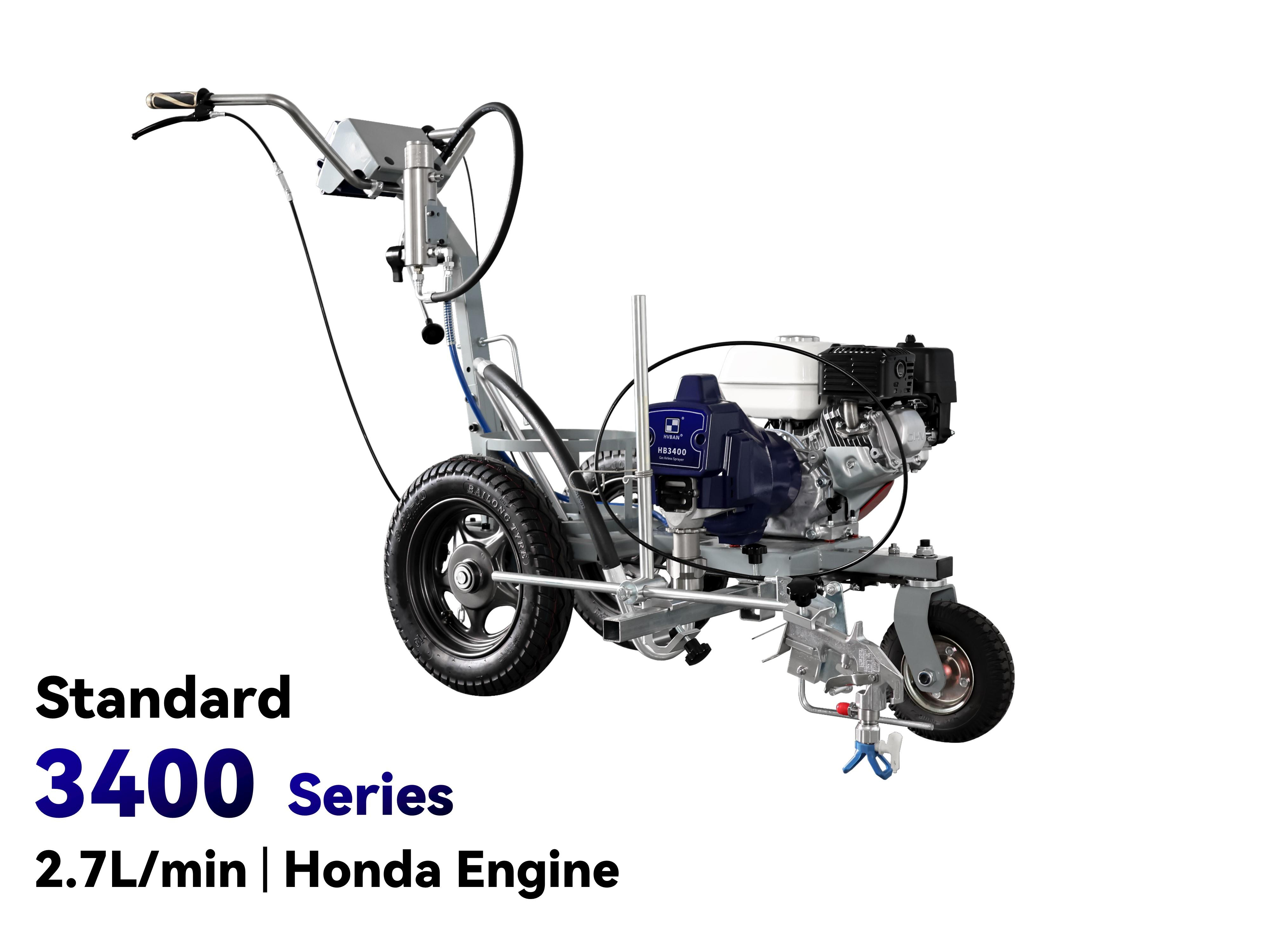 La marqueuse routière HB3400 est un appareil performant et compact conçu pour peindre précisément une seule bande routière. Équipée d’un moteur HONDA fiable de 4125 W, elle offre un débit maximal de 2,7 L/min avec une pression de travail de 22,7 MPa. Fonctionnant avec un seul pistolet et une buse de taille maximale de 0,027", cette machine garantit une application uniforme et durable des lignes.